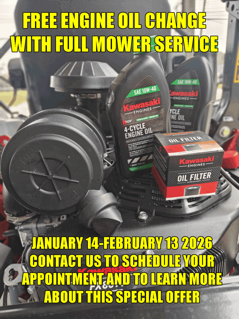 We are offering a free oil filter & 2 quarts of oil to customers that have a full mower service performed in our service department. This offer is limited to gasoline powered equipment and is valid until the 13th of February 2026. Only one redemption per customer – contact our service department to schedule your service, offer must be presented at time of appointment to qualify.